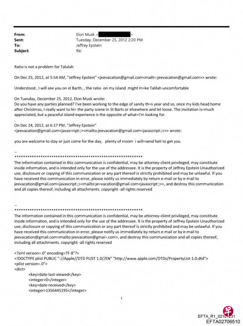 2012年11月,爱泼斯坦给马斯克发了一封邮件,问“你们会带多少人坐直升机去岛上?”