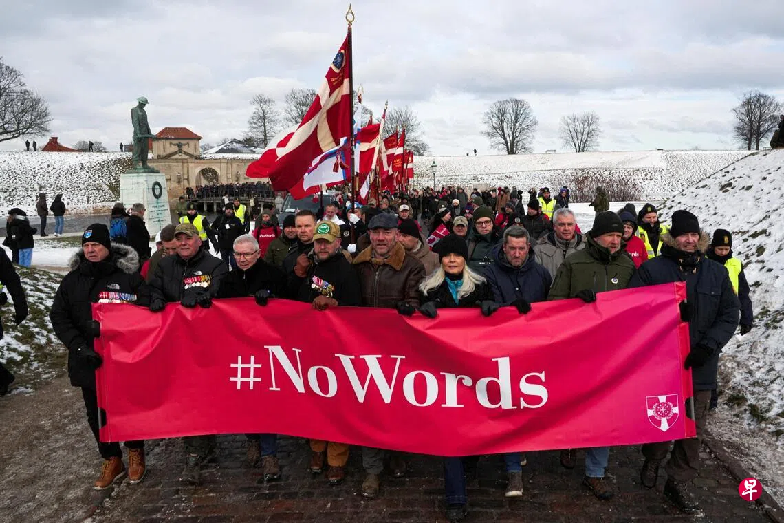 示威者星期天(2月1日)在美国驻丹麦大使馆外插满绣有阵亡者姓名的丹麦国旗,还有许多参与者佩戴服役期间获得的勋章。