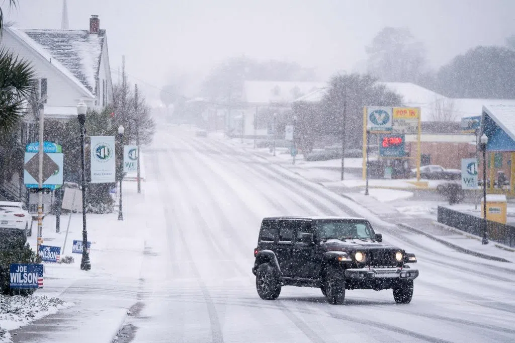 北卡星期六发生750起车祸,福斯特市积雪逼近40厘米;加斯托尼亚出现惊险一幕,一列火车高速撞上卡在轨道上的半挂卡车,将车辆碾压变形,所幸无人受伤。