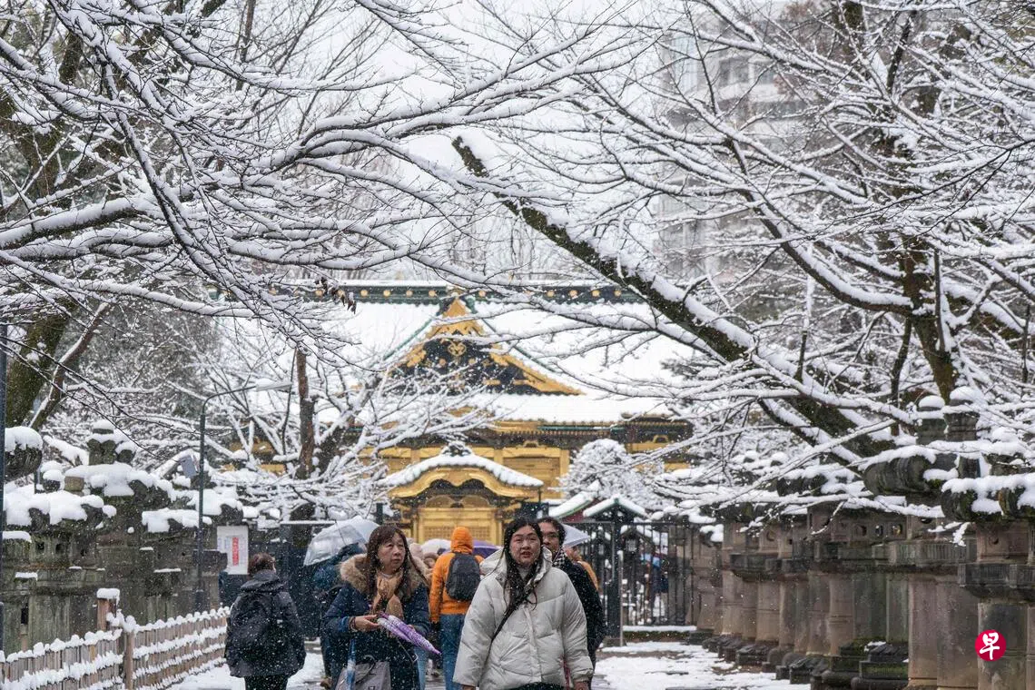 日本海沿岸大片地区星期天(2月8日)普降大雪,首都东京市中心也覆盖着一层薄薄的积雪。