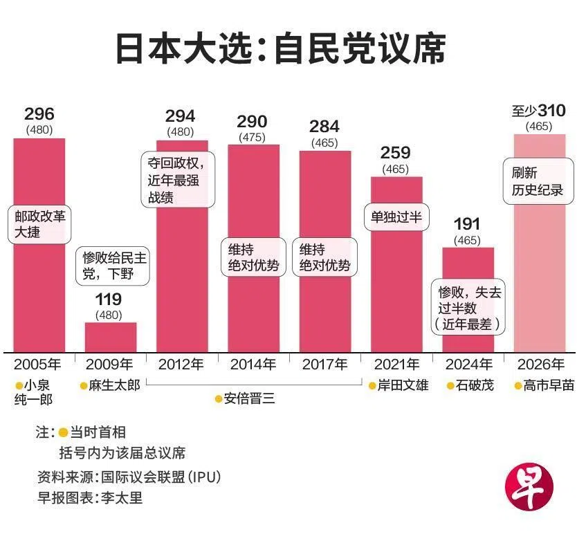 日本第51届众议院选举投票星期天(2月8日)在大雪天里拉开帷幕,首相高市早苗领军的自民党大胜,已单独拿下至少310席,让众院回归一党独大,而且创下自民党1955年创党以来的最佳战绩。