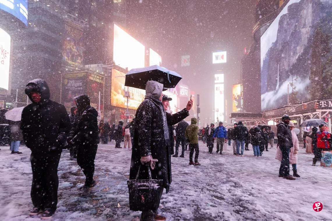 受恶劣天气影响,美国多地机场出现大规模航班取消和延误。航班追踪网站FlightAware数据显示,22日和23日共有超过9000架次美国境内及进出美国的航班已取消或将取消。图为纽约时代广场上行色匆匆的行人。(彭博社)