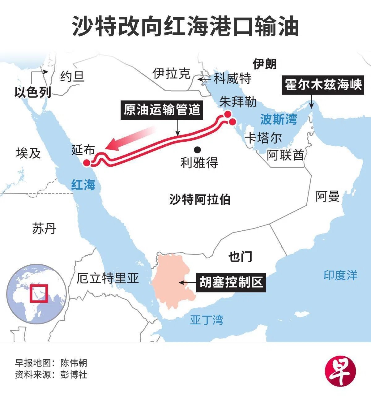 沙特阿拉伯于是绕过霍尔木兹航线,改将原油经半岛管道输送到红海沿岸的港口延布,然后从红海向南行,最终通过曼德海峡走出亚丁湾。可是,在到达曼德海峡之前,须经过数百英里由胡塞武装控制的海岸线。