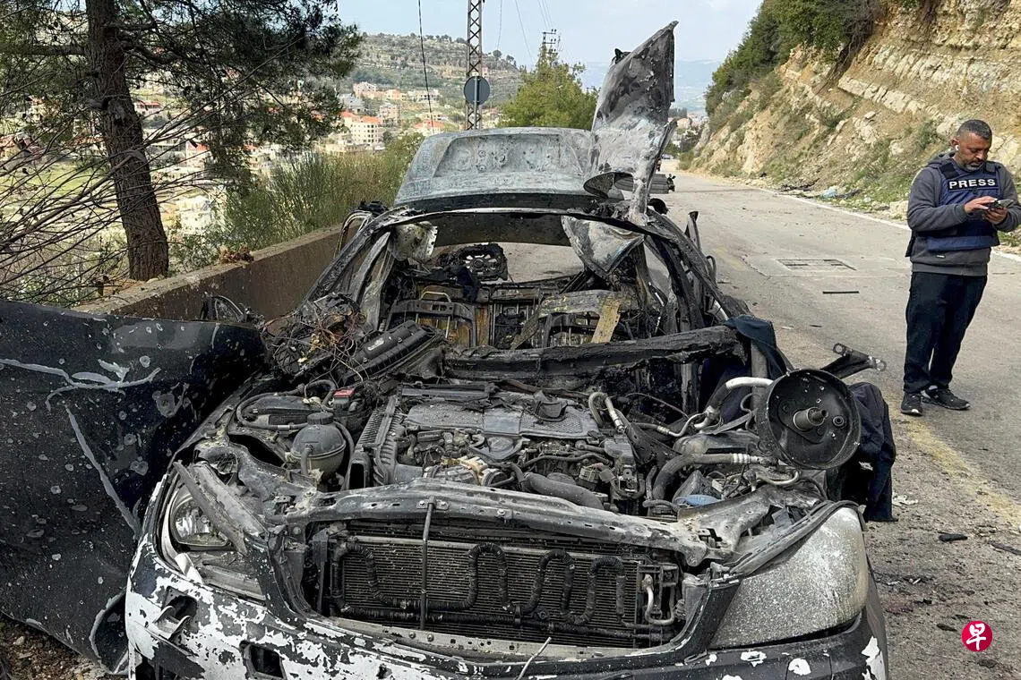 以色列战机星期六(3月28日)对黎巴嫩南部地区发动空袭,定点清除一名黎灯塔电视台记者和摄影员,以及一名黎广场电视台记者,以国防军指前者是黎巴嫩真主党拉德万部队武装人员、系统性泄露在黎南和边界地区作战的以军士兵位置。黎总统奥恩对以军袭击导致三名记者遇难表示强烈谴责,并说这是一起公然的犯罪行为。图为黎记者乘坐的汽车被以军战机的精确制导炸弹击毁。(路透社)