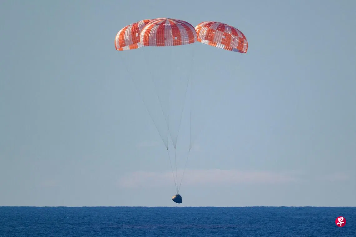 返回舱打开三顶主降落伞,主伞确保飞行器缓慢和安全地着陆。返回舱有多套降落伞,确保即使一个减速伞、一个主伞或其他降落伞部件发生故障时,宇航员仍能安全着陆。(路透社)