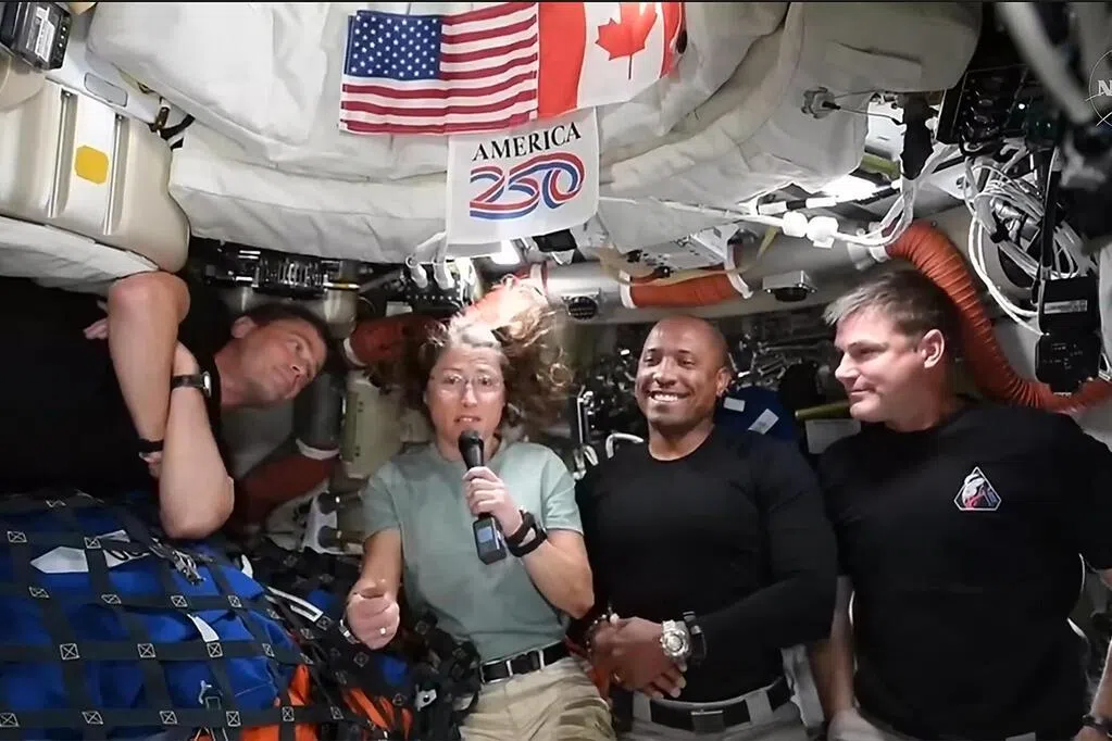 国际空间站的宇航员威廉姆斯(Chris Williams,左起)、哈撒韦(Jack Hathaway)、梅尔(Jessica Meir)和阿德诺(Sophie Adenot),在空间站的穹顶舱内观测猎户座飞船返回地球。(路透社)