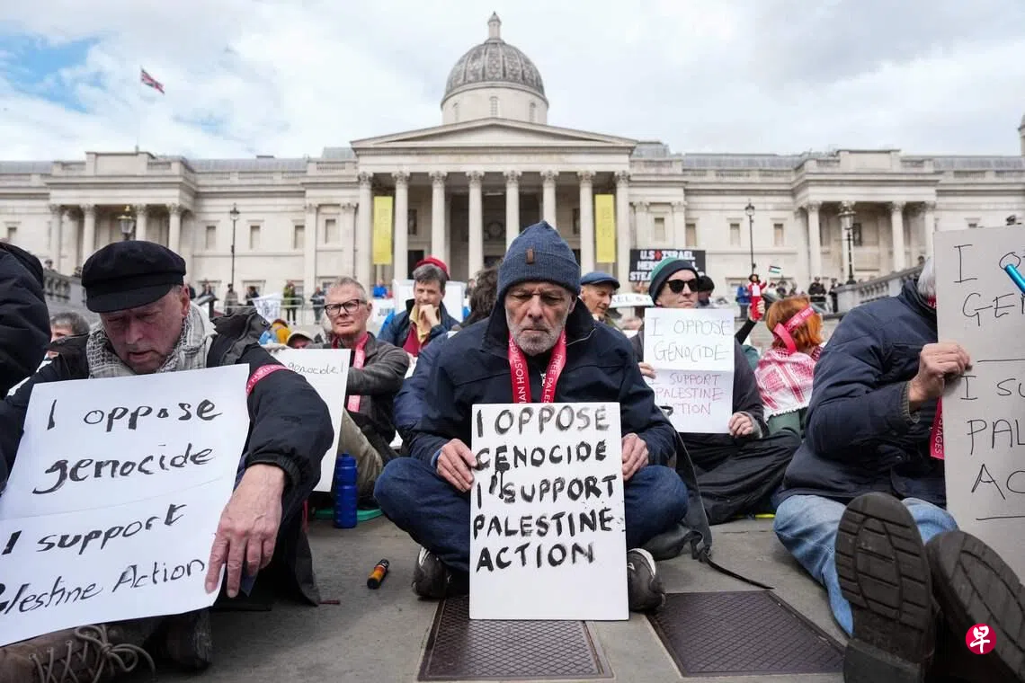数百人聚集在伦敦特拉法加广场,许多人手持支持“巴勒斯坦行动”组织的标语,上面写着“我反对种族灭绝,我支持巴勒斯坦行动”。这些标语曾在“巴勒斯坦行动”此前组织的抗议活动中出现。