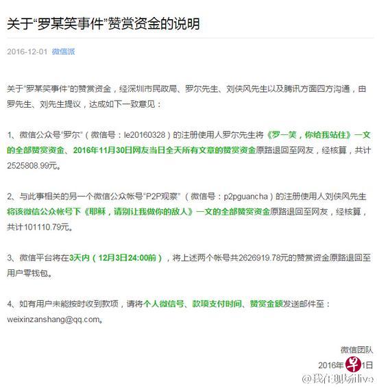 与此事相关的另一个微信公众帐号“P2P观察”的注册使用人刘侠风先生将该微信公众帐号下《耶稣,请别让我做你的敌人》一文的全部赞赏资金原路退回至网友,经核算,共计101110.79元。微信平台将在12月3日24:00前,将上述两个帐号共2626919.78元的赞赏资金原路退回至用户零钱包。