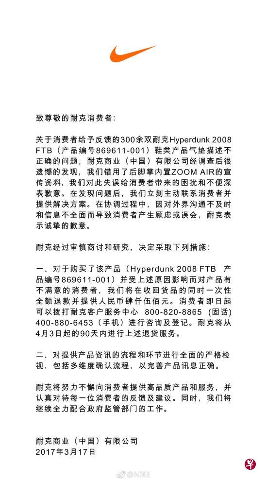 据中新网报道, 17日,耐克公司在其官方微博就问题气垫鞋发表道歉声明,称耐克Hyperdunk 2008 FTB鞋用错宣传资料。针对已购买该问题鞋的消费者,收回货品同时一次性全额退款并提供人民币肆仟伍佰元。