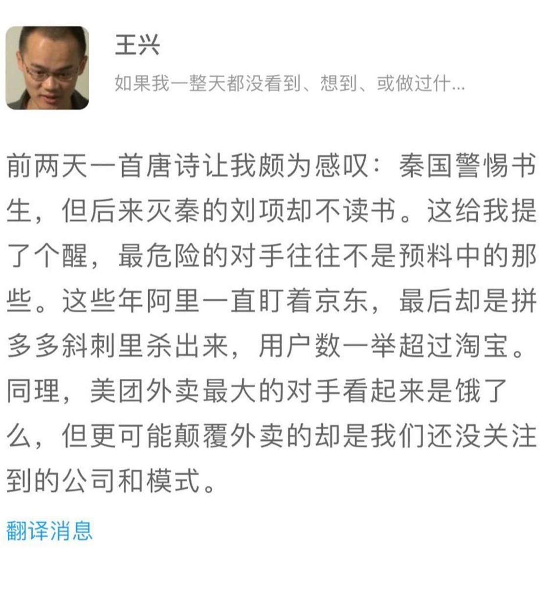 对于“一诗激起千层浪”,王兴据报删除了文章,并发文解释,指引用《焚书坑》诗句的原意是希望提醒自己,最大的敌人可能并不是竞争对手,而是一些“没有关注到的公司和模式”。