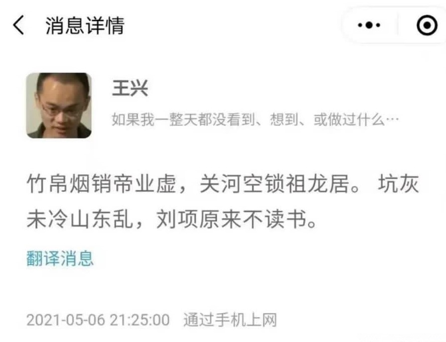 综合《星岛日报》、网媒“香港01”等港媒报道,王兴上周四(6日)在中国社交平台“饭否”上,转发了唐代诗人章碣的《焚书坑》,诗文如下:“竹帛烟消帝业虚,关河空锁祖龙居。坑灰未冷山东乱,刘项原来不读书。”