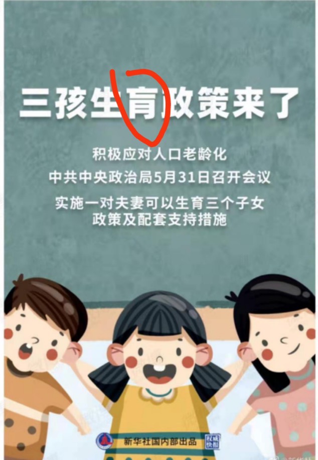 有人更拿官媒的宣传海报出现的错别字开刷:“三孩生育的‘育’字故意少一点,是病入膏肓。”著名导演张艺谋的第二任妻子陈婷则发文:“提前完成任务”。2013年5月,张艺谋夫妇因“超生”,生育了三个子女,被罚款共计人民币748万余元(约150万新元)。