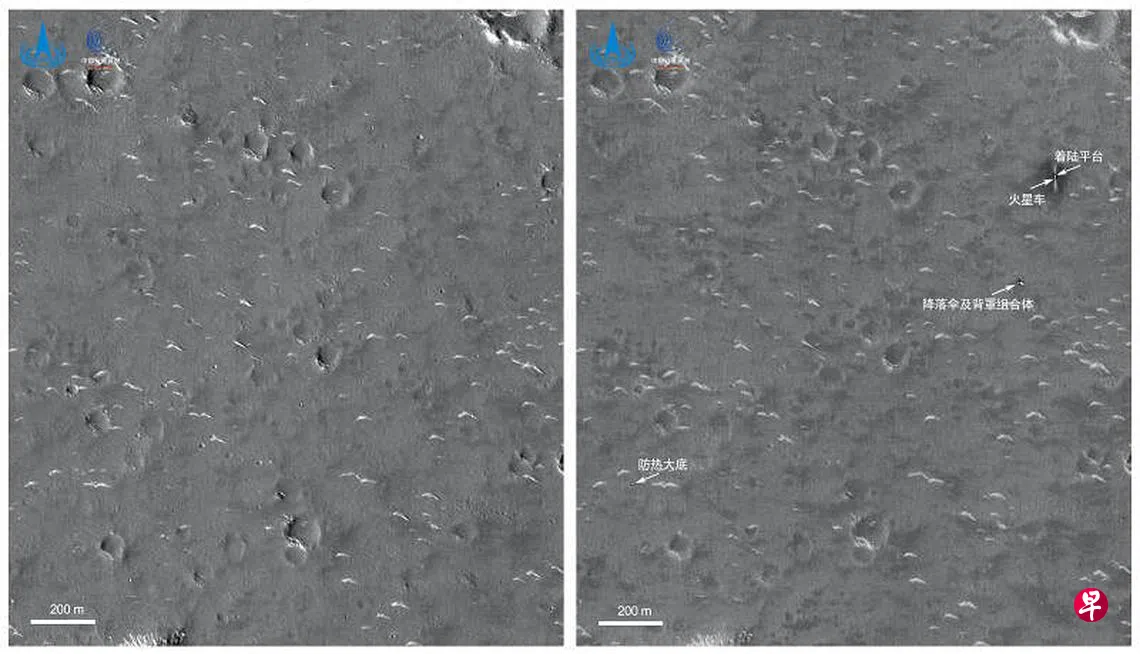 据中国央视新闻客户端报道, 影像图由天问一号环绕器高分辨率相机,于6月2日18时拍摄。图像右上角有两处明显亮斑,靠上的亮斑由两个亮点组成,较大亮点为天问一号着陆平台,较小亮点为“祝融号”火星车。以着陆平台亮点为中心,周围区域颜色较暗,据分析,可能是降落过程中受到发动机羽流影响造成。