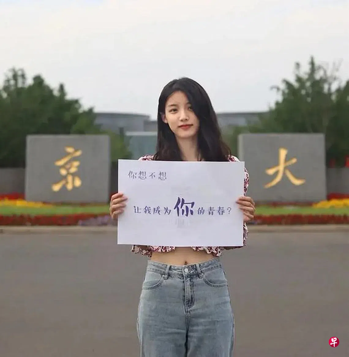 女生举着的牌子上写有:“你想不想让我成为你的青春?”“你想不想和我一起泡在图书馆,从早晨到夜晚?”