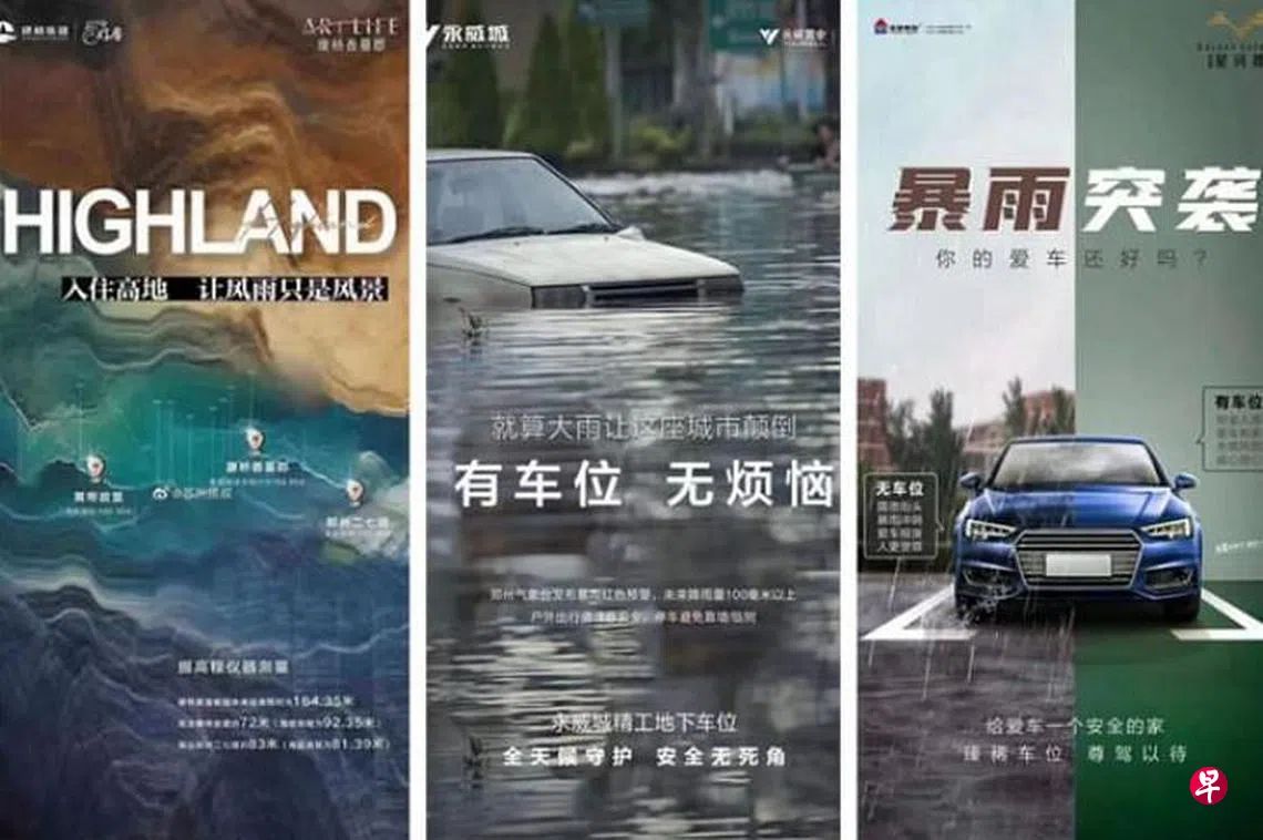 其中一张海报上有“永威城”字眼,配图是一张被水淹过半身的汽车,广告语为“就算大雨让这座城市颠倒,有车位,无烦恼”。