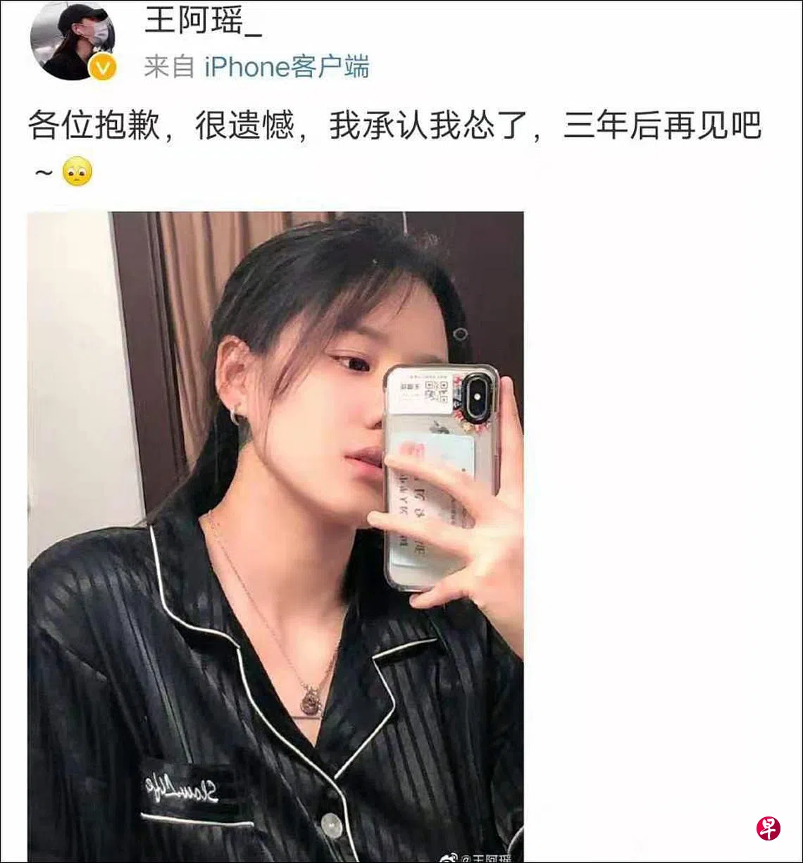 综合观察者网和中新网报道,王璐瑶昨天在预赛中出现失误,无缘决赛。她赛后在微博上载一张自拍照,写道“各位抱歉,很遗憾,我承认我怂了,三年后再见吧。”