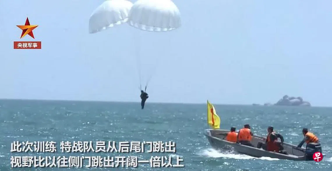 据中国央视军事2日在微博上传影片,显示驻扎在中国大陆东南沿海的解放军第73集团军某特战旅,在闽南某海域进行成军以来首次海上跳伞训练。