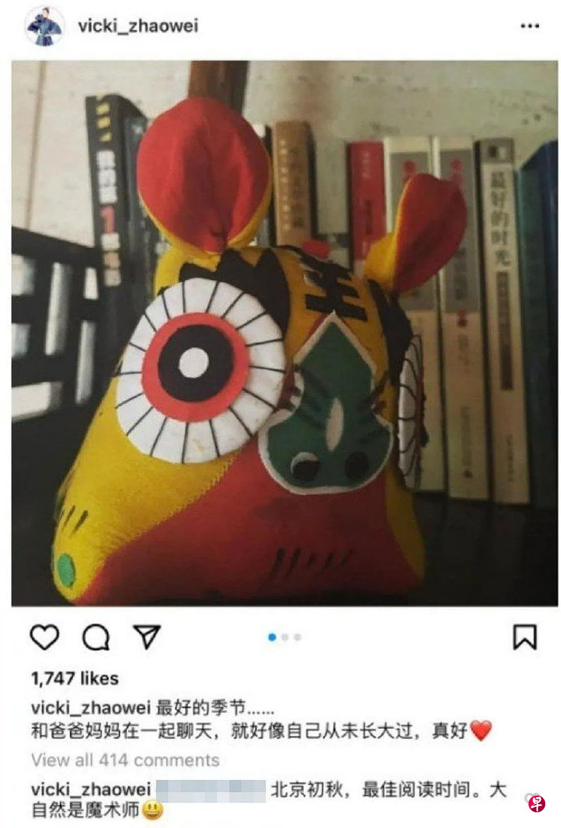 网媒“香港01”和台湾《联合报》报道,赵薇今天下午在其IG上发了三张照片,并留言说:“最好的季节......和爸爸妈妈在一起聊天,就好像自己从未长大过,真好。”
