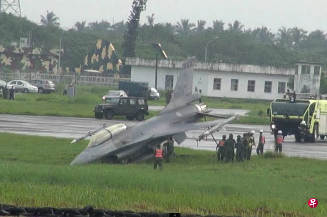 台湾军方汉光演习下月中登场,一架F16战机今早(31日)6点30分在屏东机场预演战备道起降时意外滑出跑道,机头插入土中,台湾空军称人员安全,飞机轻损。