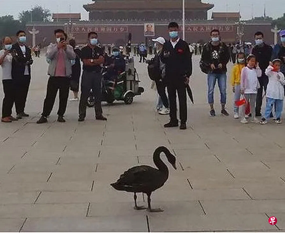 一只黑天鹅昨天(5日)早上出现在北京天安门广场,吸引民众驻足围观,也引发中国网民对黑天鹅寓意的讨论。