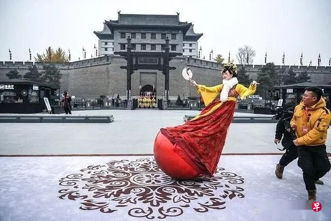 作为西安大唐不夜城的金字招牌,身穿盛唐服装的“不倒翁小姐姐”化着精致的古装妆面,戴着古装发饰,脚下踩着一个不会倒的半圆来回舞动,吸引了无数的游客,她的表演视频也在网上走红。