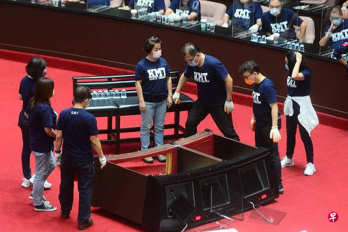 台湾立法院今天(10月1日)再次上演朝野攻防,国民党团不但占领发言台,也推倒了行政院长苏贞昌备询时所使用的讲台。
