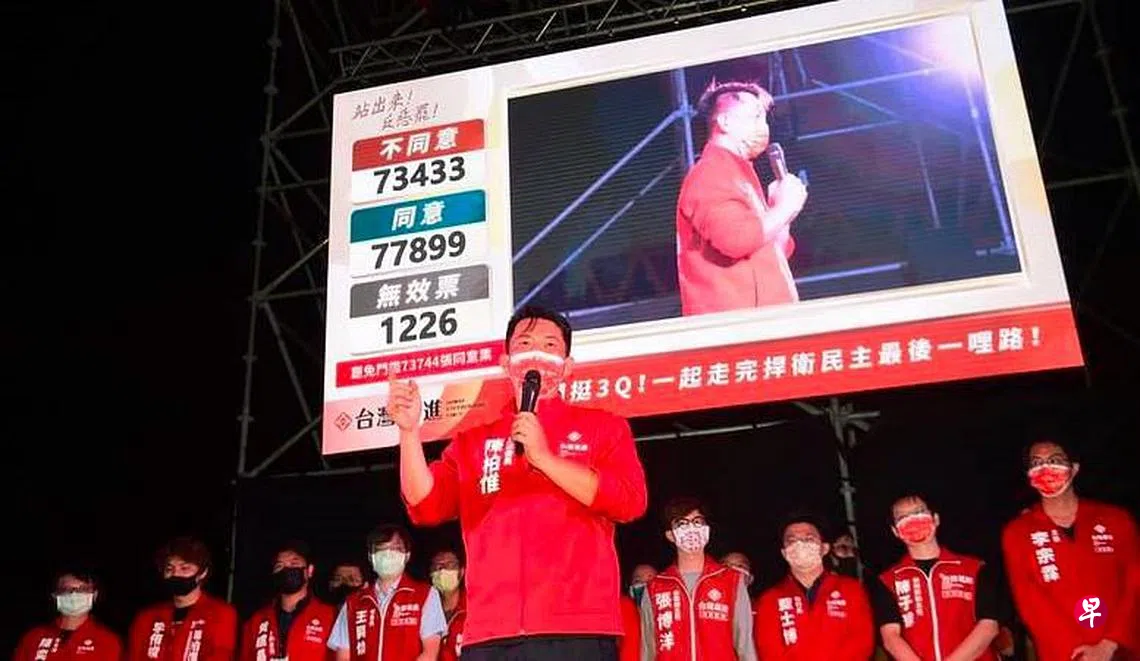 台湾深绿的基进党立委陈柏惟罢免投票案今天(23日)登场,有效同意罢免票达到罢免门槛,且同意票多过不同意票,罢免案通过。