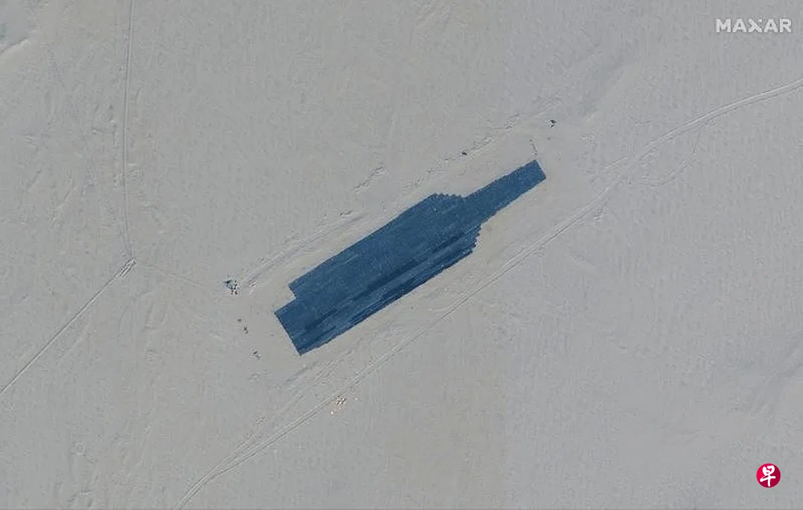 卫星图像显示,中国军方正在西部偏远沙漠的武器试验场地,使用美国航母的模型作为打击目标。