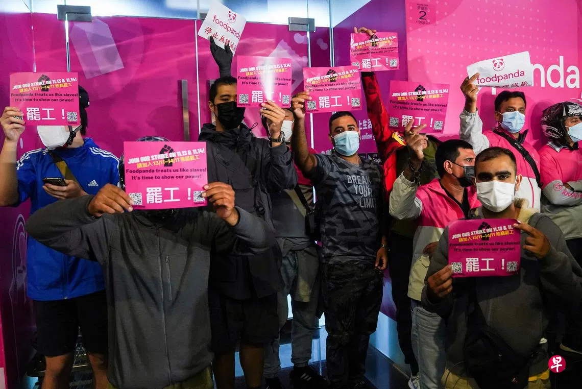 据香港中通社报道,一批Foodpanda外卖员昨天在公司门外举起“还我血汗钱”等标语,同时高喊口号,以示抗议。