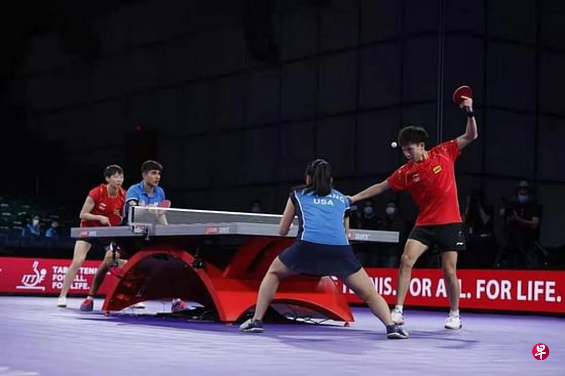 中美跨国乒乓球混双组合林高远和张安、卡纳克和王曼昱在美国休斯顿当地时间22日进行了世乒赛前的首次合练。