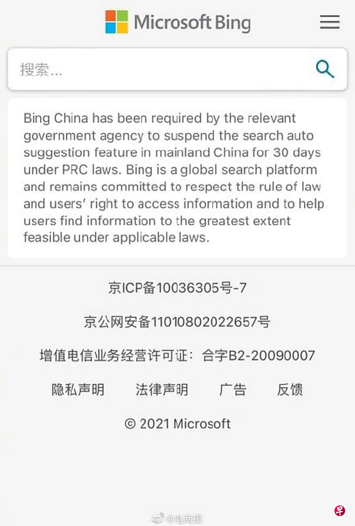 美国微软公司旗下网络搜索平台必应(Bing)宣布,他们在政府机构的要求下,暂停在中国的系统自动建议(auto suggest)功能30天。
