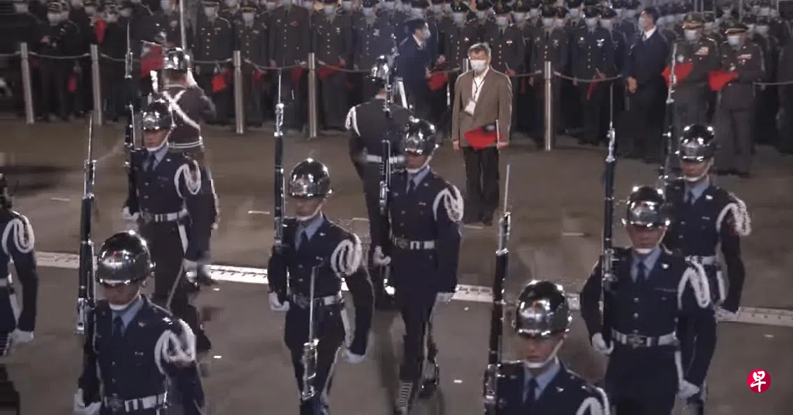 综合Etoday新闻云和台湾《联合报》报道,当柯文哲在工作人员的安排下抵达现场定位时,正好是三军仪队的演出,由于贵宾区只有柯文哲一人,他的后方站了一整排身穿军服的军方人员,前方则是三军仪队的演出,画面显得格外突兀,甚至被形容像是“总统阅兵”。