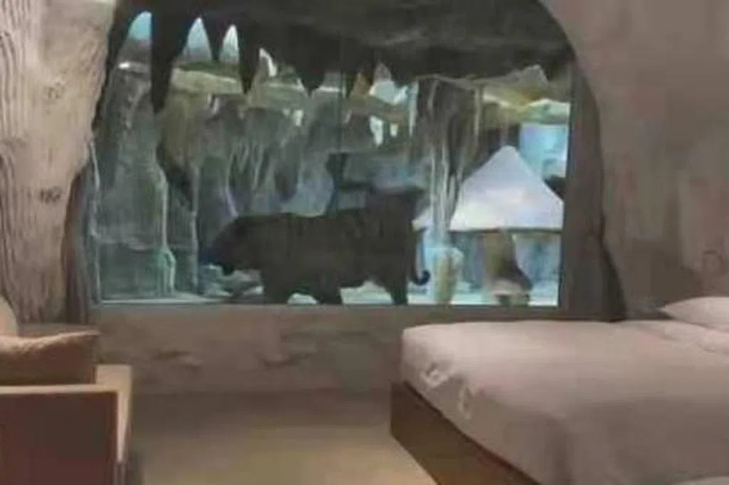 网传视频显示,酒店房间的窗户外有一只老虎踱步并向里探看。不少网民对与老虎只隔着玻璃的“虎景房”的住宿安全、动物福利提出质疑。
