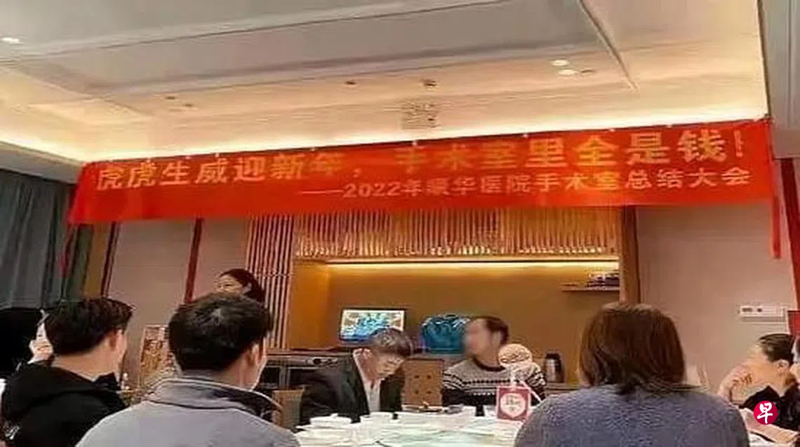 中国东莞一家民营医院年会聚餐,横幅标语竟写着“手术室里全是钱”,引起网民一片哗然。