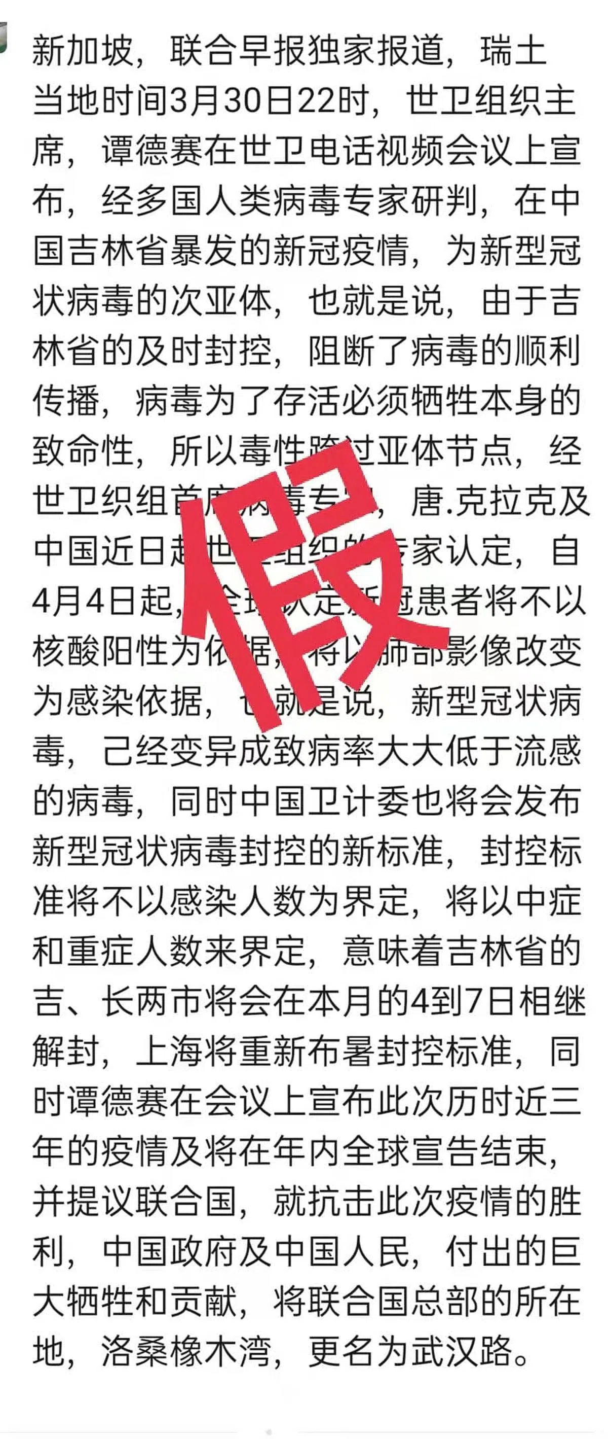中国互联网上流传一则宣称是“联合早报独家报道”的消息,指世界卫生组织总干事谭德塞3月30日22时在世卫电话视频会议上谈及中国疫情。该消息还指,中国将发布冠病封控新标准等。