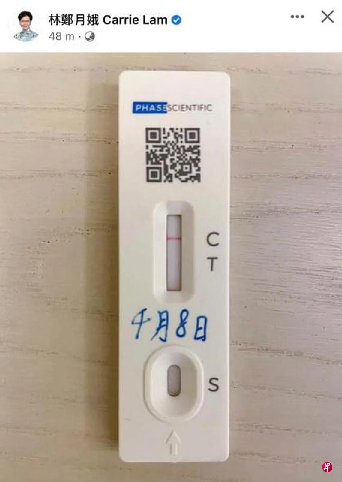 林郑还在个人面簿主页上发帖说,她自己今早已进行快速抗原测试,结果为阴性,可以安心上班。