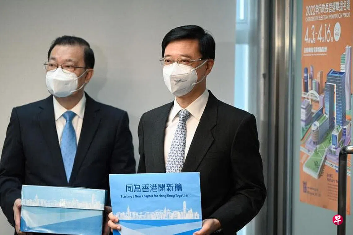 综合香港01网站及星岛日报报道,李家超与竞选办主任谭耀宗,于早上约9时22分到达现场。李家超手持写有“同为香港开新篇”标语的公文袋。