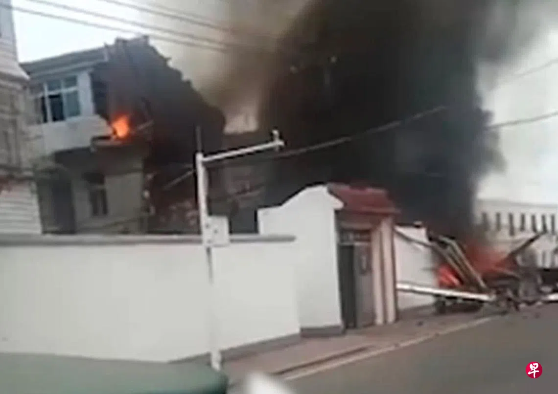 网传照片显示,现场黑色的浓烟滚滚,部分民房起火。