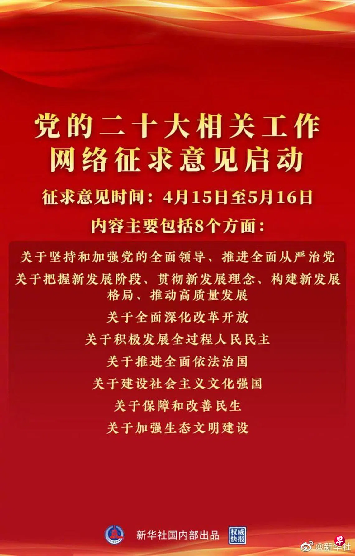 据中国央视新闻报道,中共二十大相关工作网络征求意见活动从4月15日至5月16日开展,在人民日报社、新华社、中央广播电视总台所属官网、新闻客户端以及“学习强国”学习平台分别开设专栏,听取全社会意见建议。