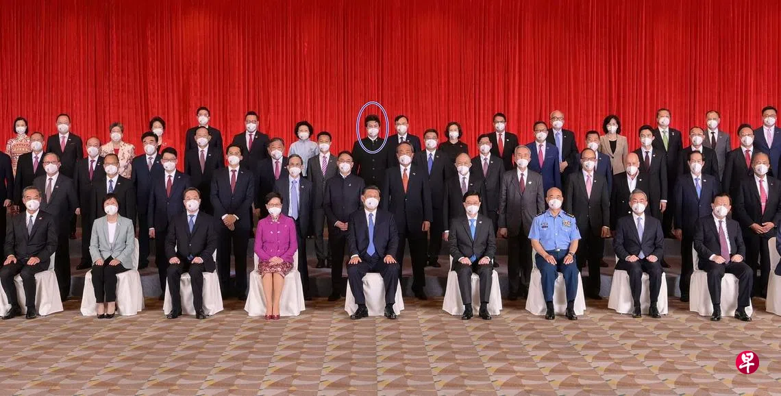 综合《星岛日报》、网媒“香港01”报道,习近平周四到访香港时,曾与香港社会各界人士会面和合照;据港府新闻处发布的照片显示,何俊贤站在最后排中间位置,习近平的正后方。当时所有人都戴了口罩。