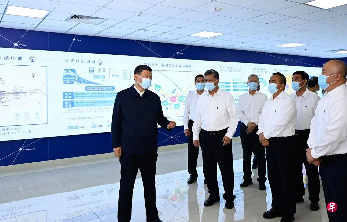 习近平12日下午在乌鲁木齐国际陆港区听取整体情况介绍,通过实时画面察看中欧班列(乌鲁木齐)集结中心各功能区和阿拉山口口岸、霍尔果斯口岸现场作业情况,并同工作人员及现场办事人员亲切交流。