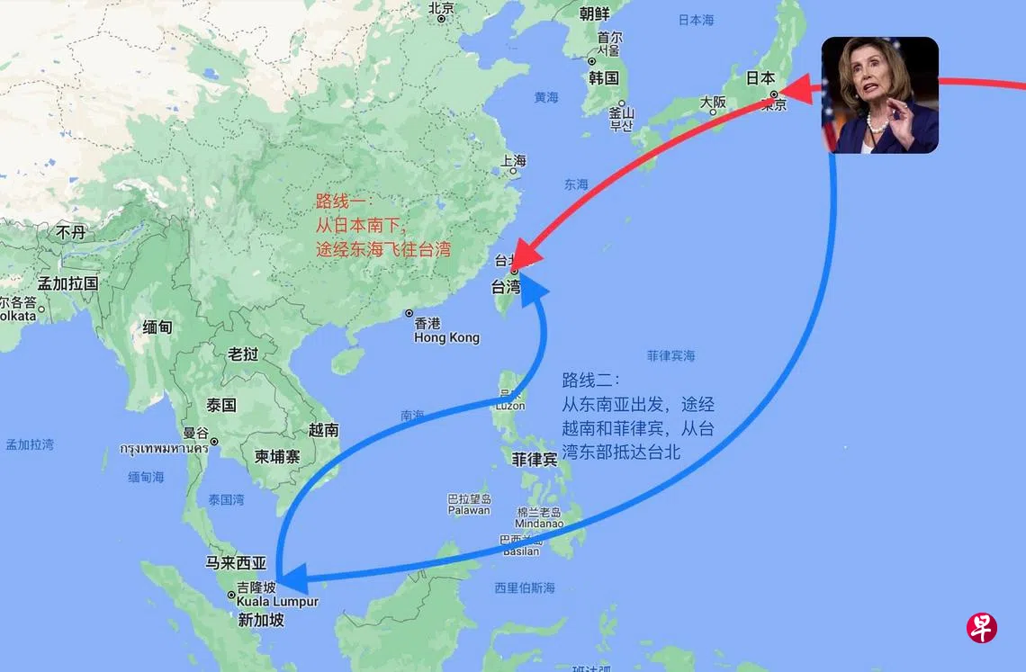 郭正亮分析,如果佩洛西从东南亚前往台湾,她有可能从台湾东部,飞抵台北松山机场,这样就能避开比较敏感的台海西岸和东海,避免跟中国大陆直接碰撞。