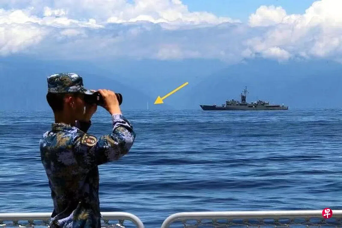 在官方发布的军舰航行照片中,一名解放军士兵在军舰甲板上手持望远镜观察,照片近处是一艘舰艇,远处则是海岸线和山脉,海岸线上的白色柱状建筑物依稀可见。