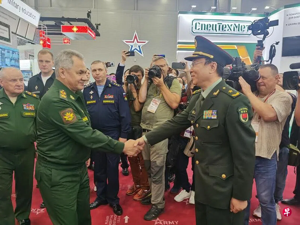 据中新社报道,在中国驻俄罗斯国防武官隗延伟和中央军委装备发展部代表陪同下,绍伊古等俄方官员仔细参观了位于莫斯科州“爱国者”会展中心的中国防务展区。