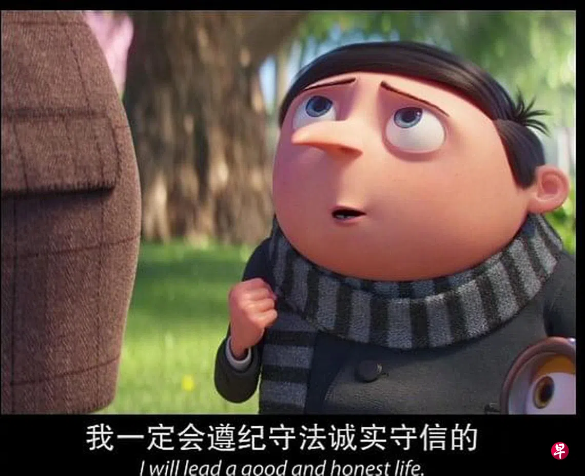 格鲁在添加的一帧画面中还信誓旦旦的保证:“我一定会遵纪守法,诚实守信”。