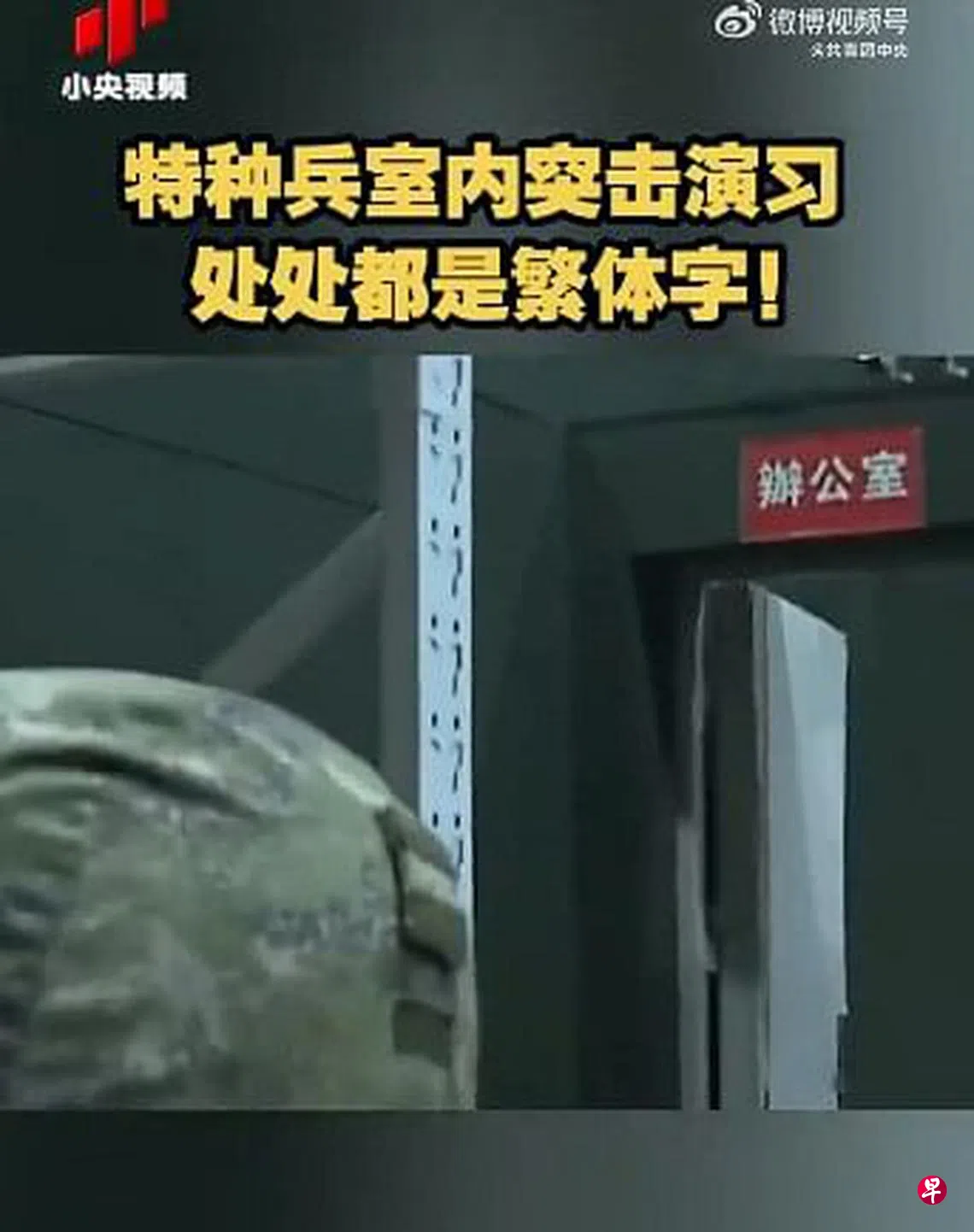 在这段公开视频中,解放军特种兵正进行室内突袭演习,他们身着迷彩服闯入一栋建筑物内,而建筑物出现繁体的“办公室”、“储藏室”等字样,视频也打出“处处都是繁体字”的大标题。
