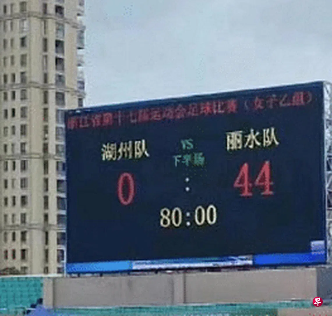据上游新闻报道,网传视频可见,星期四(9月1日)举行的浙江省第十七届运动会足球项目(女子乙组)比赛中,由湖州队对阵丽水队,比分最终锁定在0 : 44。视频引发广泛关注,不少网民质疑是否存在假球问题。
