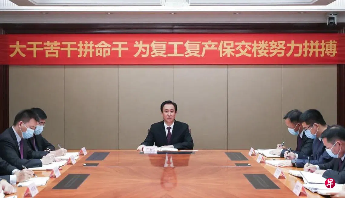恒大集团官方微信发布的照片中,许家印正坐中间讲话,背后的红色横幅印着大字:“大干苦干拼命干,为复工复产保交楼努力拼搏”。