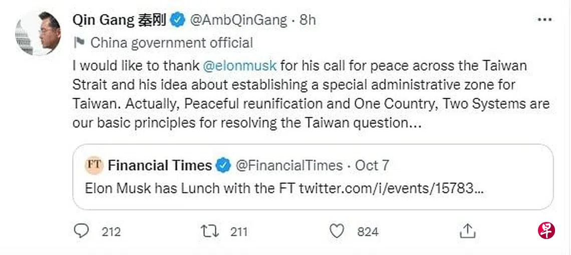 秦刚当地时间星期六(10月8日)在个人推特账号转发英国《金融时报》对马斯克的专访,并写道:“我想感谢@elonmusk(马斯克)对两岸和平的呼吁以及他关于建立台湾特区的想法。”
