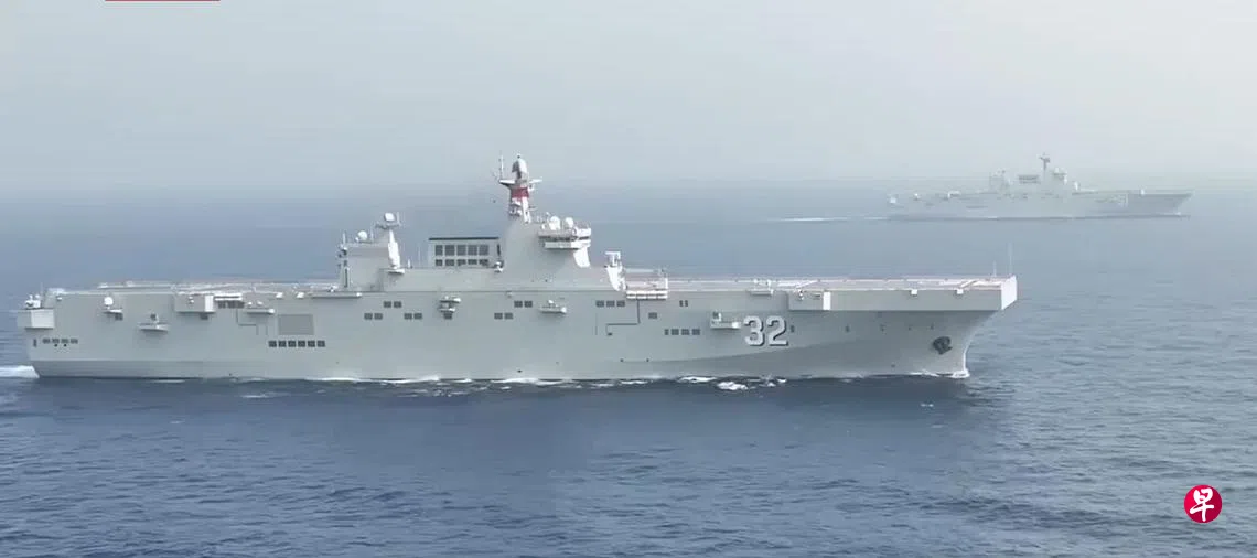 中国两艘075型两栖攻击舰海南舰和广西舰“同框”出现,在南中国海完成联合立体登陆、海上航行补给等多项全训合格考核。